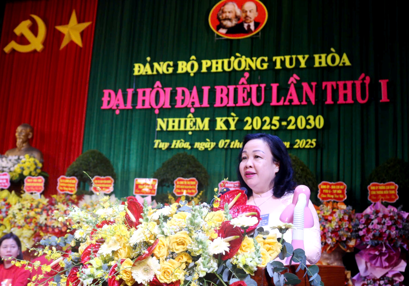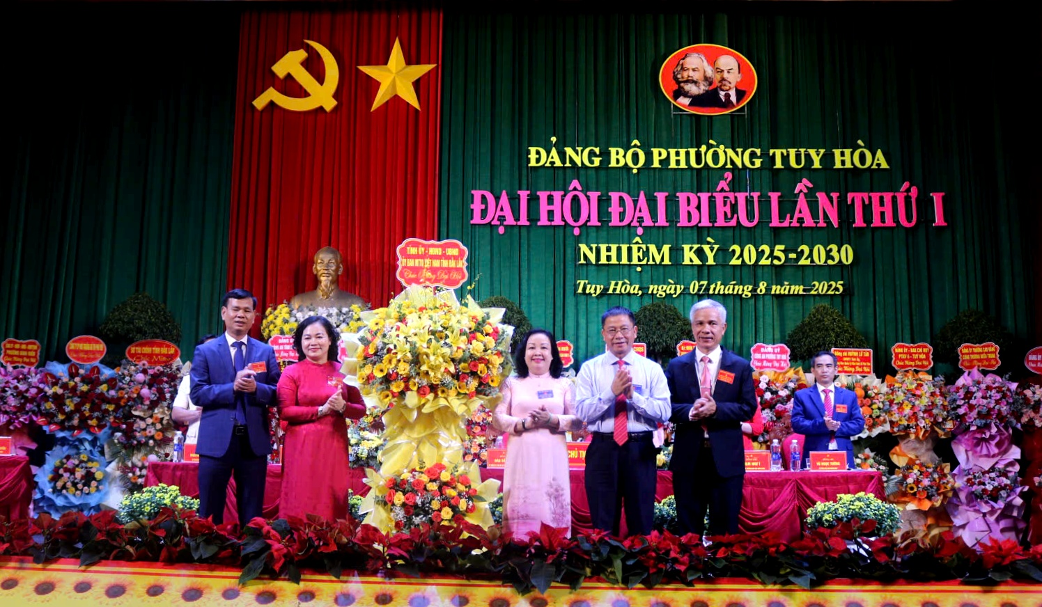 Lãnh đạo Trung ương và tỉnh tặng hoa chúc mừng Ban Chấp hành Đảng bộ phường Tuy Hòa nhiệm kỳ 2025 - 2030.